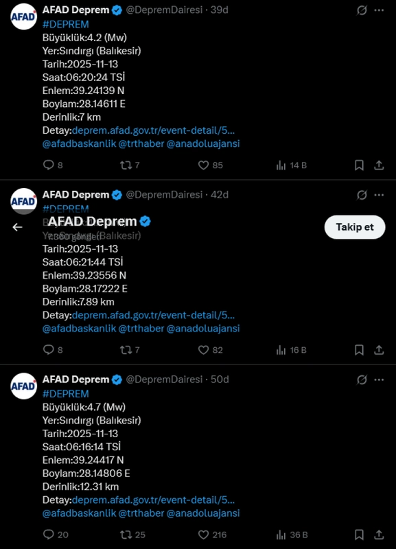 İlk deprem saat 06:16’da 4,7 büyüklüğünde, diğer iki deprem ise 06:20 ve 06:21’de 4.2 büyüklüğünde kaydedildi.