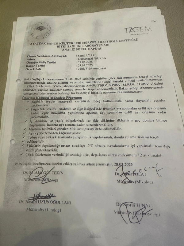 ‎‎Analiz sonuçlarına göre alınan fidelerin mantar hastalığı taşıdığı, temiz gösterilmesine rağmen belgelerde oynama yapıldığı saptandı.