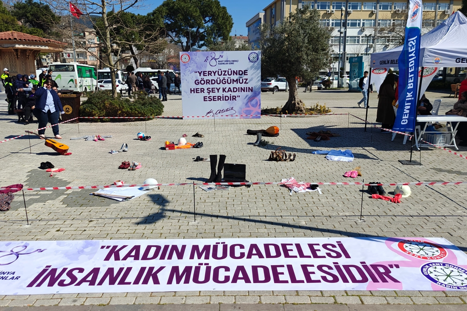 Bursa'nın Gemlik ilçesinde 8 Mart Dünya Emekçi Kadınlar Günü dolayısıyla Zeytin Dalı Meydanı’nda düzenlenen etkinlikte, sivil toplum kuruluşları ve vatandaşlar kadınların eşitlik ve hak mücadelesine destek için bir araya geldi.