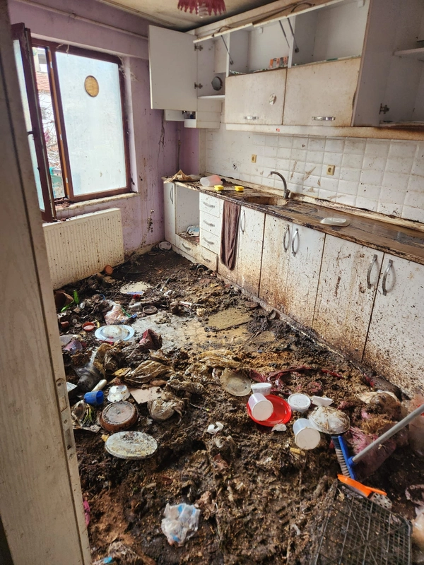 Evin tamamen boşaltılmasının ardından, biriken çöplerin neden olduğu bakteri, haşere ve kötü koku oluşumunu engellemek amacıyla binanın içi ve çevresi detaylı bir şekilde ilaçlanarak dezenfekte edildi.