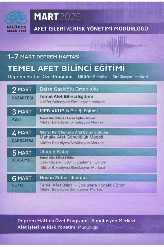 4 Mart Çarşamba günü Nilüfer Kent Konseyi Afet Çalışma Grubu’nun katılımıyla Mahalle Afet Gönüllülük Modeli’nin ele alınacağı eğitimlerde acil durum tahliye senaryoları da birebir simüle edilecek. 5 Mart Perşembe günü Uludağ Koleji öğrencilerine “Çök-Kapan-Tutun” uygulamalı eğitimi verilirken, haftanın kapanışı 6 Mart Cuma günü Hüsnü Züber İlkokulu öğrencileri için hazırlanan çocuklara yönelik özel afet farkındalık eğitimi ile yapılacak.