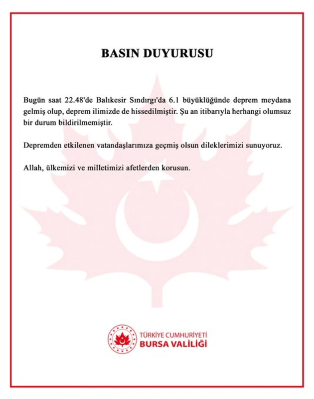 Balıkesir Sındırgı'da 6.1 büyüklüğünde meydana gelen deprem Bursa'da da kuvvetli hissedilmişti. Bursa Valiliği'nden yapılan açıklamada, il genelinde olumsuz bir durum yaşanmadığı bildirilerek, vatandaşlara 'geçmiş olsun' dilekleri iletildi.