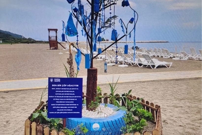 Karacabey Kurşunlu Halk Plajı’ndaki temizlik çalışmasında toplanan çöp ve atıklar, vatandaşlar tarafından boyanarak geri dönüşüm temalı çöp ağacına dönüştürüldü.