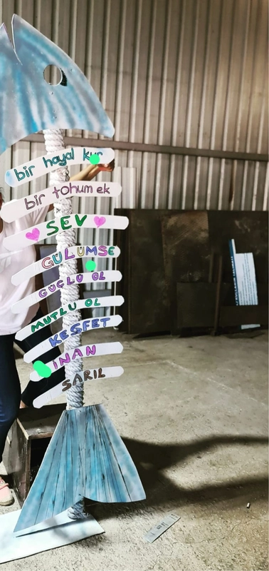 Sahillerdeki temizlik etkinliklerinde elde edilen kapaklarla ‘mavi bayrak’ temalı pano oluşturulurken, plastik şişelerden gemi maketi yapılarak çevre kirliliğine dikkat çekildi.