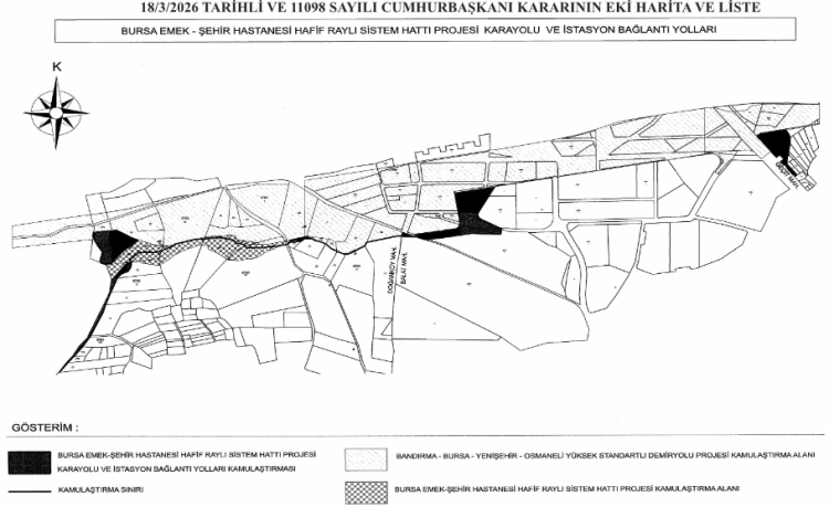Cumhurbaşkanı kararıyla, Bursa Emek-Şehir Hastanesi Hafif Raylı Sistem Hattı kapsamında yapılacak YHT Garı bağlantıları için Osmangazi ilçesinde Geçit, Nilüfer'de ise Doğanköy ve Balat mahallelerinde bazı taşınmazların acele kamulaştırılmasına karar verildi.