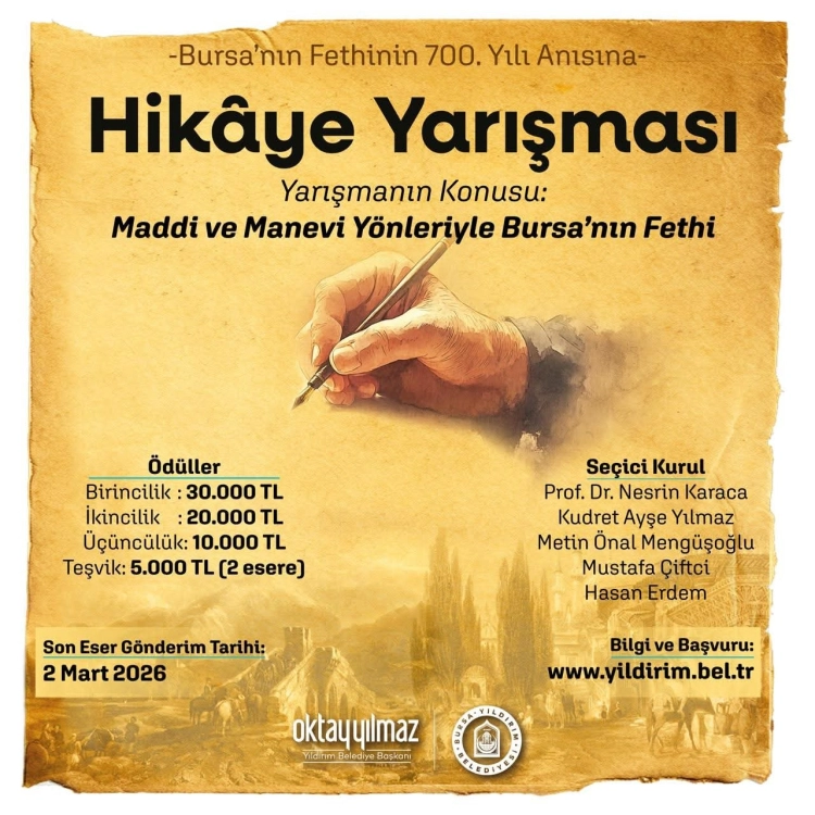 Yıldırım Belediyesi, Bursa’nın fethinin 700. yılını anlamlı bir şekilde anmak amacıyla iki ayrı alanda yarışma düzenliyor. Hikâye ve minyatür dallarında gerçekleştirilecek yarışmalarda, katılımcılar Bursa’nın fethini hem maddi hem de manevi yönleriyle ele alacak.