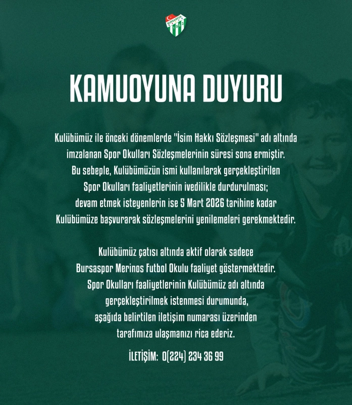 BURSA (İGFA) - Bursaspor Kulübü, önceki dönemlerde “İsim Hakkı Sözleşmesi” kapsamında imzalanan Spor Okulları sözleşmelerinin süresinin sona erdiğini açıkladı. Kulüp yönetimi, sözleşme süresi biten kurumların Bursaspor adı altında yürüttüğü faaliyetlerin derhal durdurulması gerektiğini bildirdi. Açıklamada, faaliyetlerine devam etmek isteyen spor okullarının 5 Mart 2026 tarihine kadar kulübe başvurarak sözleşmelerini yenilemeleri gerektiği vurgulandı.