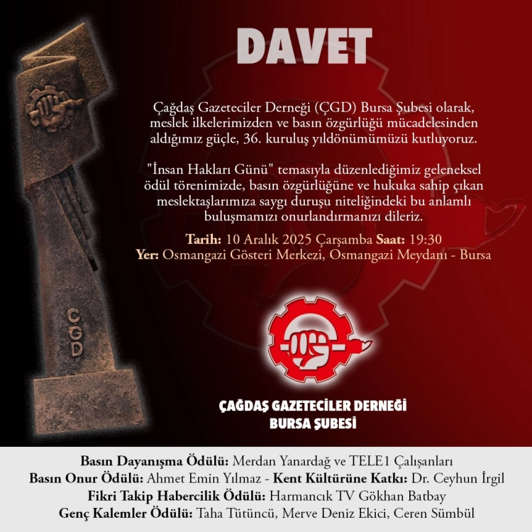 ÇGD Bursa Şubesi’nin geleneksel ödül töreni, 10 Aralık 2025 Çarşamba günü saat 19.30’da Osmangazi Gösteri Merkezi’nde “İnsan Hakları” temasıyla gerçekleştirilecek.