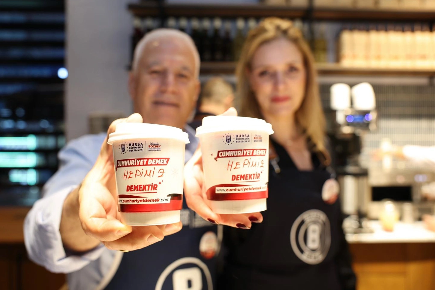 Eşi Seden Bozbey ile birlikte barista önlüklerini giyen Başkan Bozbey, Cumhuriyetin 102. yılına özel olarak hazırlanan ‘Cumhuriyet Demek’ temalı bardaklarda içecek ikramında bulundu. Vatandaşların isimlerini ‘Cumhuriyet demek' temalı bardaklara yazan Başkan Mustafa Bozbey ve eşi Seden Bozbey, Atatürk’ün emanet ettiği Cumhuriyet’in sıcaklığını Bursalılarla birlikte paylaştı. Bu sene kutlamaların teması olan ‘Cumhuriyet demek, hepimiz demek’ sloganını da yazarak ikramda bulunan Başkan Bozbey ve eşi Seden Bozbey, kahve keyfini vatandaşlarla birlikte yaşadı.