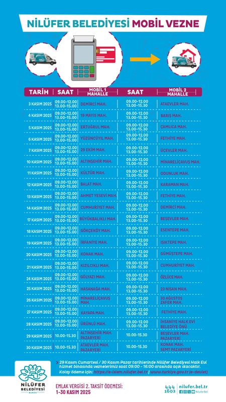 Nilüfer Belediyesi Halk Evi, Alaaddinbey, Çalı, Görükle ve Göçmen Konutları’ndaki sabit vezneler hizmet veriyor. Şehir merkezine uzak Gölyazı, Hasanağa, Akçalar ve Kayapa gibi mahallelere ise her gün farklı saatlerde 2 mobil vezne gidiyor. Mobil veznelerde nakit veya kredi kartıyla ödeme yapılabiliyor.