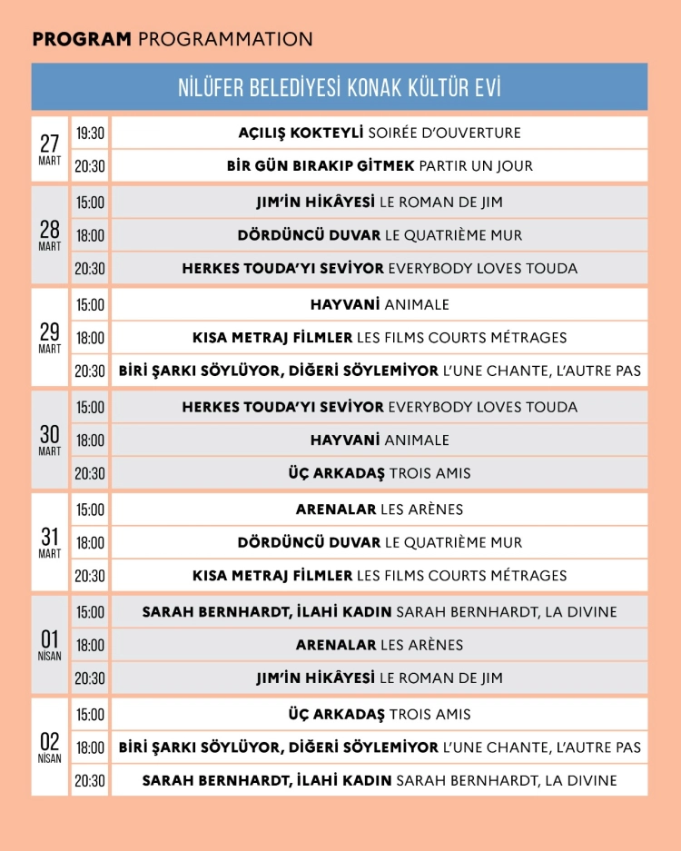Institut Français, Fransa, Belçika, Kanada, Lüksemburg ve İsviçre büyükelçilikleri ile Alliance Française Bursa ve Türk-Fransız Kültür Derneği iş birliğiyle hayata geçirilen Frankofon Film Festivali, 27 Mart’ta kapılarını açıyor. Nilüfer Belediyesi Konak Kültürevi’nin ev sahipliği yapacağı festival, 27 Mart günü açılış kokteyli ile başlayacak. Açılış filmi, aynı zamanda geçen yıl Cannes Film Festivali'nin açılış filmi olan “Bir Gün Bırakıp Gitmek” olacak. Gösterim kokteyl sonrası gerçekleşecek.