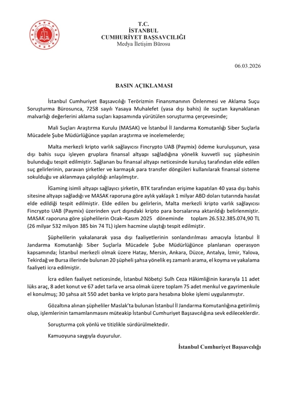İstanbul Cumhuriyet Başsavcılığı, yasa dışı bahis ve suç gelirlerini aklama iddiaları kapsamında yürütülen soruşturma çerçevesinde 20 şüpheliye yönelik eş zamanlı operasyon düzenlendiğini açıkladı. MASAK raporlarına göre şüphelilerin 11 ayda yaklaşık 26,5 milyar liralık işlem hacmine ulaştığı belirlendi.