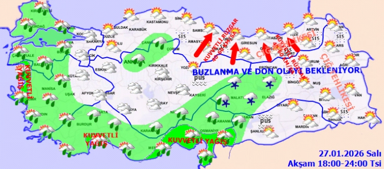 Sabah ve gece saatlerinde iç ve doğu bölgelerde buzlanma, don, pus ve sis etkili olacak. Doğu Karadeniz’in iç kesimleri ile Doğu Anadolu’nun yüksek ve eğimli alanlarında ise çığ tehlikesi bulunuyor.