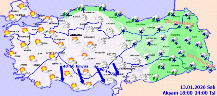 Doğu Akdeniz kıyıları ile Güneydoğu Anadolu’nun güneyinde yağmur ve sağanak, yağış alan diğer yerlerde karla karışık yağmur ve kar şeklinde görülmesi beklenen yağışların, Doğu Anadolu'nun güneydoğusu, Siirt, Batman ve Rize çevreleri ile Artvin'in kıyı kesiminde yerel kuvvetli olacağı tahmin ediliyor.