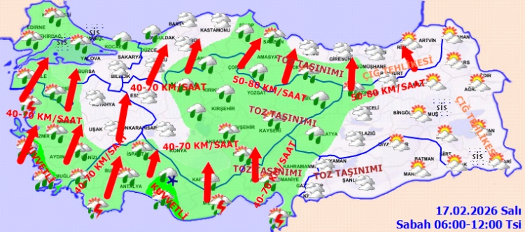 Rüzgar genellikle güney yönlerden hafif ara sıra orta kuvvette, Marmara'nın güneyi, Ege, Akdeniz, İç Anadolu, Batı ve Orta Karadeniz’in iç kesimlerinde kuvvetli ve kısa süreli fırtına (40-70 km/saat), Doğu Karadeniz’in iç kesimlerinde yer yer fırtına (50-80 km/saat) şeklinde eseceği tahmin ediliyor.