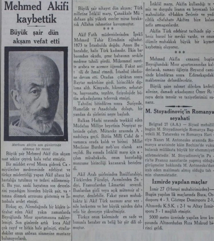 Mehmet Akif’in ölümüyle ilgili bir gazete haberi (Cumhuriyet, 28 Aralık 1936).