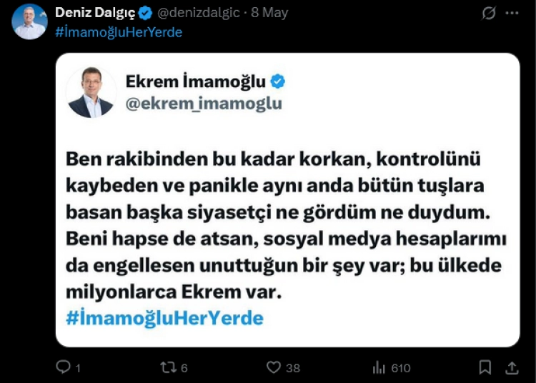 Bursa'da Mudanya Belediye Başkanı Deniz Dalgıç, 5 ay sonra yeniden açılan X hesabından, “Cumhurbaşkanı adayımız Ekrem İmamoğlu’na ses olmak için kapatılan bu hesap, bugün yeniden ses veriyor” paylaşımı yaptı.