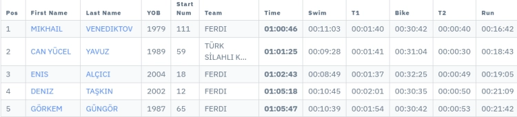 2025 Avrupa Triatlon Balkan Şampiyonası ve Yaş Grupları Sprint Türkiye Kupası Finalleri’ndeki genel sıralamalarda 170 erkek sporcu arasında ferdi yarışan 46 yaşındaki Mikhail Venediktov 1 saat 46 saniyelik derecesiyle birinci olurken,