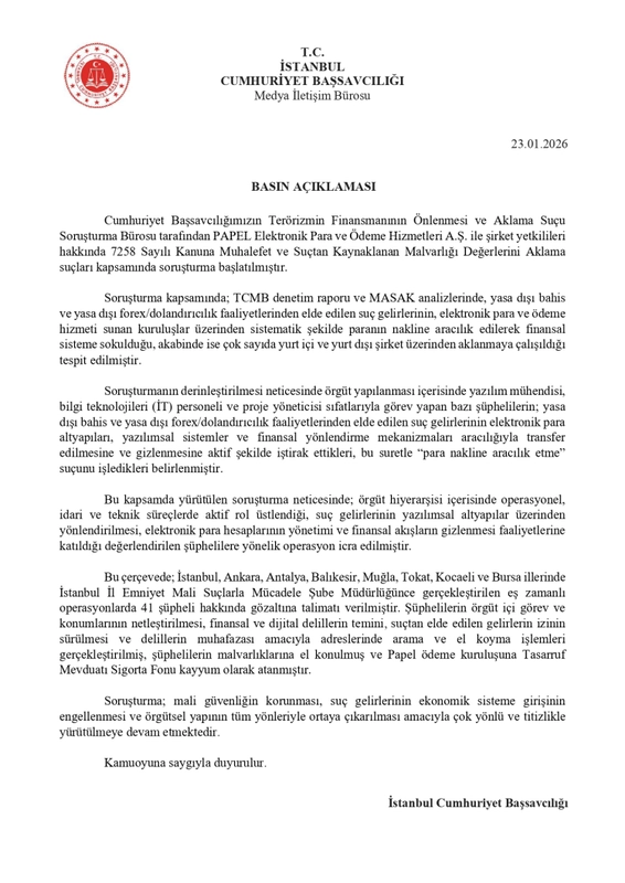 İstanbul Cumhuriyet Başsavcılığı tarafından yürütülen soruşturma kapsamında, PAPEL Elektronik Para ve Ödeme Hizmetleri A.Ş. ile şirket yetkilileri hakkında yasa dışı bahis ve suçtan kaynaklanan malvarlığı değerlerini aklama suçlarından işlem başlatıldı. 8 ilde düzenlenen eş zamanlı operasyonlarda 41 şüpheli gözaltına alındı.