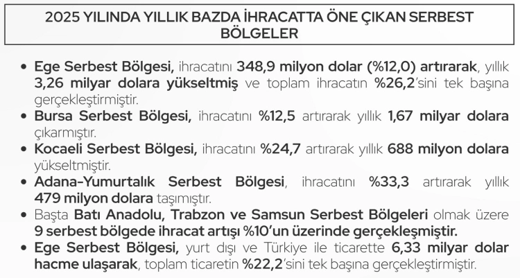 İhracatta öne çıkan serbest bölgeler arasında Ege Serbest Bölgesi, 3,26 milyar dolarlık ihracatla ilk sırada yer aldı. Bölge, toplam ihracatın yüzde 26,2’sini tek başına gerçekleştirdi. Bursa Serbest Bölgesi 1,67 milyar dolar, Kocaeli Serbest Bölgesi 688 milyon dolar ve Adana-Yumurtalık Serbest Bölgesi ise 479 milyon dolarlık ihracata ulaştı. Dokuz serbest bölgede ihracat artışı yüzde 10’un üzerinde gerçekleşti.