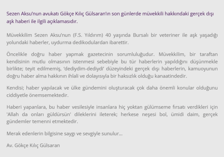 Açıklamada, “Müvekkilim Sezen Aksu’nun (F.S. Yıldırım) 40 yaşında Bursalı bir veteriner ile aşk yaşadığı yolundaki haberler, uydurma dedikodulardan ibarettir.” ifadelerine yer verildi. Doğru haber yapmanın gazetecilik sorumluluğu olduğuna dikkat çeken Av. Gökçe Kılıç Gülsaran, teyit edilmemiş ve gerçek dışı içeriklerin kamuoyunun doğru haber alma hakkını ihlal ettiği vurgulayarak, bu tür haberlerin haksızlık olduğu belirtildi.