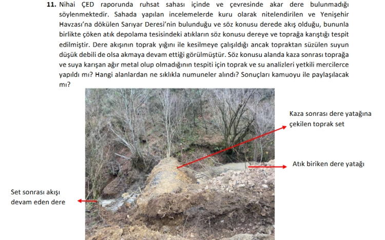 Soru ve talepler arasında, tesisin atık depolama alanının seçiminde mevsimsel koşullar ve toprak yapısının dikkate alınıp alınmadığı, ÇED raporunda belirtilen önlemlerin uygulanıp uygulanmadığı, baraj çökmesi sonrası toprağa ve suya karışan ağır metal miktarının tespiti ve analizlerin kamuoyu ile paylaşılması yer aldı.