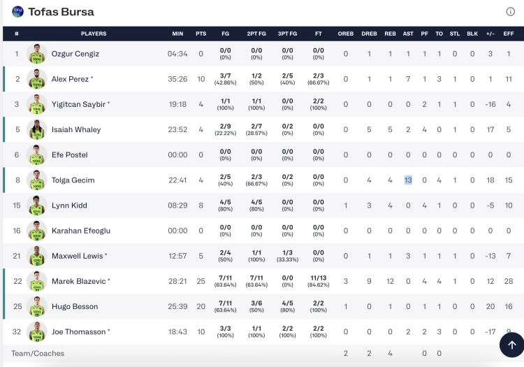 Herzliya karşısında TOFAŞ’ta Marek Blazevic 25 sayı; Hugo Besson 20 sayı; Alex Perez ve Joe Thomasson ise 10’ar sayıyla oynadı.