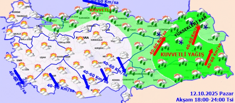 Buna göre, eüzgarın; Güney Ege, Akdeniz’in iç kesimleri, İç Anadolu’nun güneyi ve Orta Karadeniz kıyılarında kuzey yönlerinden, Doğu Anadolu’da ise güney yönlerinden kuvvetli (40-60 km/s) esmesi beklenirken, yetkililer, kuvvetli yağış ve rüzgar nedeniyle sel, su baskını, ulaşımda aksamalar ve heyelan gibi olumsuzluklara karşı vatandaşları dikkatli ve tedbirli olmalarını istedi.