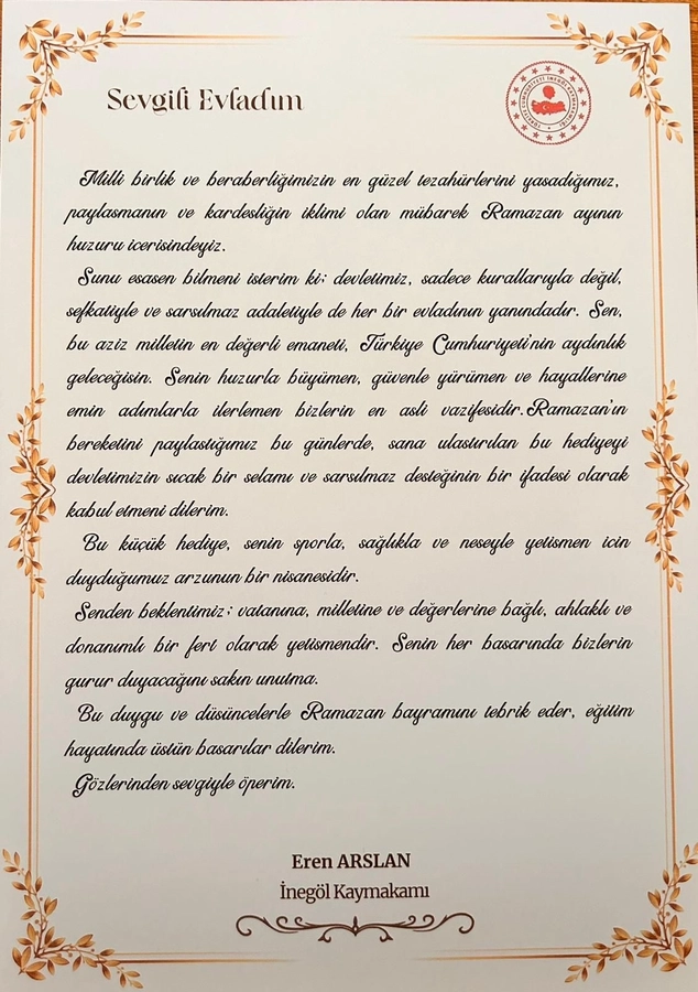 Hayırseverler tarafından alınan eşofman takımları ile Kaymakam Eren Arslan tarafından kaleme alınmış bayram tebriği mesajını içeren bir mektup, bayram öncesi okul görevlileri tarafından bizzat öğrencilerin evlerine götürülerek teslim edildi.